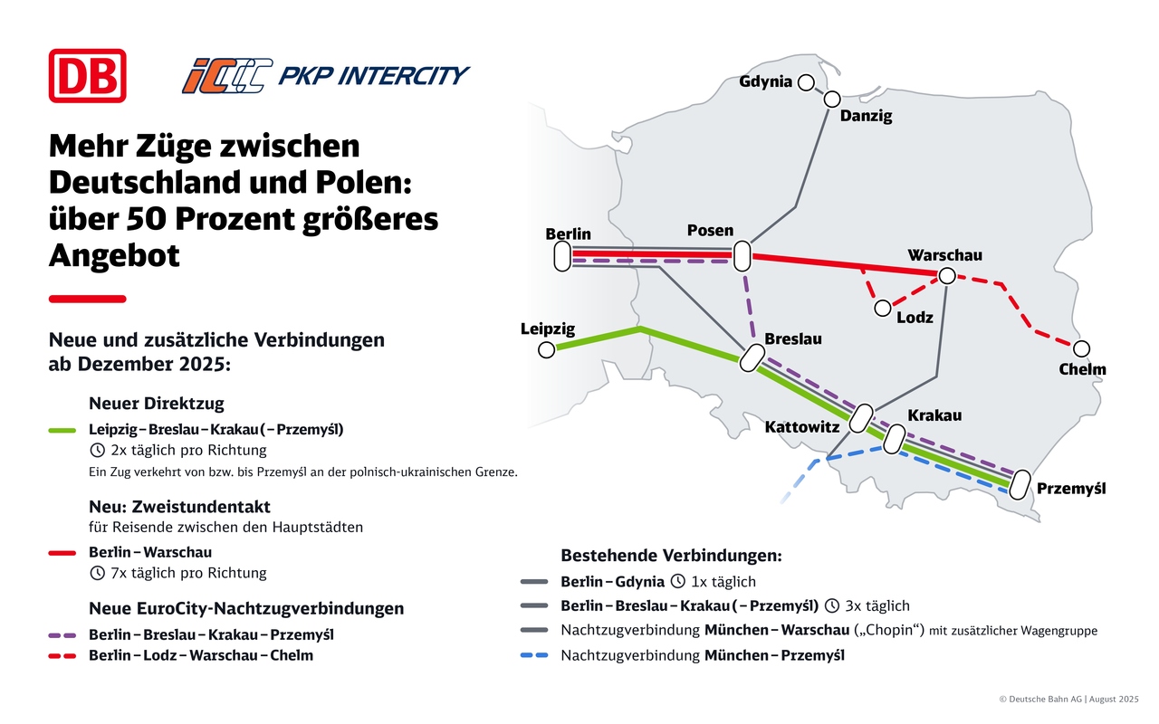 „Międzynarodowy transport dalekobieżny dynamicznie się rozwija. Chcemy znacząco zwiększyć ruch kolejowy między Niemcami a Polską. Nowe połączenia kolejowe z silnymi gospodarczo regionami południowej Polski i granicą z Ukrainą mają ogromne znaczenie gospodarcze i polityczne”, mówi Michael Peterson, członek zarządu DB ds. dalekobieżnych przewozów pasażerskich.