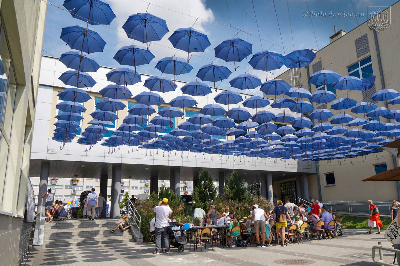 Pod kobaltowo-niebieskim niebem parasoli w miejskim centrum kultury odbywają się zajęcia dla najmłodszych artystów.