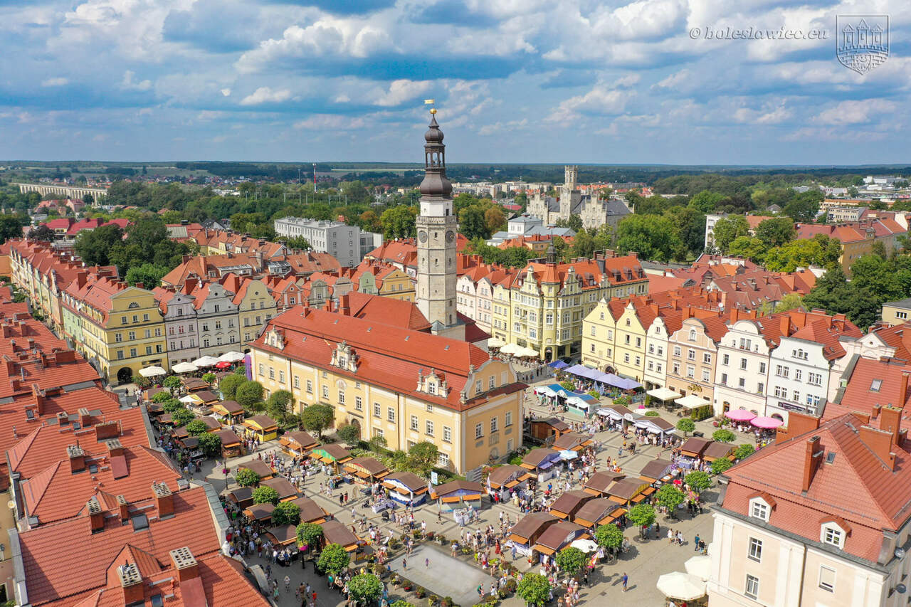 Niezliczone stoiska handlowe i wystawowe przyciągają gości Festiwalu Ceramiki na piękny rynek miasta. W tle widać wiadukt nad Bobrem i pałac Pücklera z muzeum ceramiki.