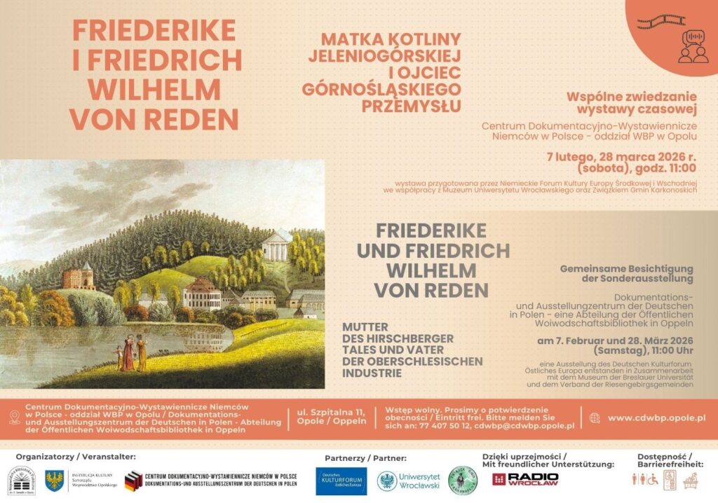 Die erste Veranstaltung ist eine gemeinsame Führung durch die Ausstellung „Friederike und Friedrich Wilhelm von Reden – Mutter des Hirschberger Tals und Vater der oberschlesischen Industrie“, die um 11:00 Uhr im Dokumentations- und Ausstellungszentrum der Deutschen in Polen – einer Einrichtung der Öffentlichen Woiwodschaftsbibliothek „E. Smołka“ in Oppeln (ul. Szpitalna 11) – stattfindet.