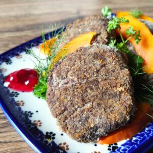 Flache Klopse formen, diese nach dem Umwenden in geriebener Semmel in heißem Pflanzenöl braun braten.