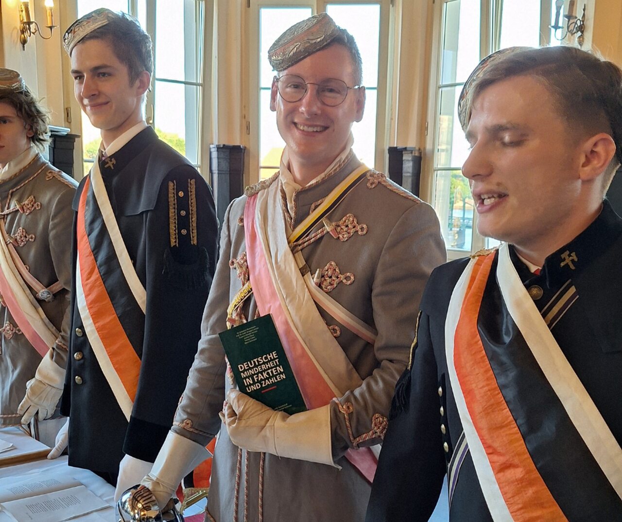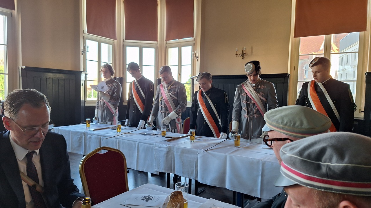 (l.) Peter Weyrauch, Gastredner beim Festkommers, neben den Chargierten der Rheno-Palatia Breslau zu Mainz. (3. v.l.) Philipp Spitzlei, Senior der Rheno-Palatia. Alle im Alten Festsaal der Verbindung auf einer Oder-Insel.