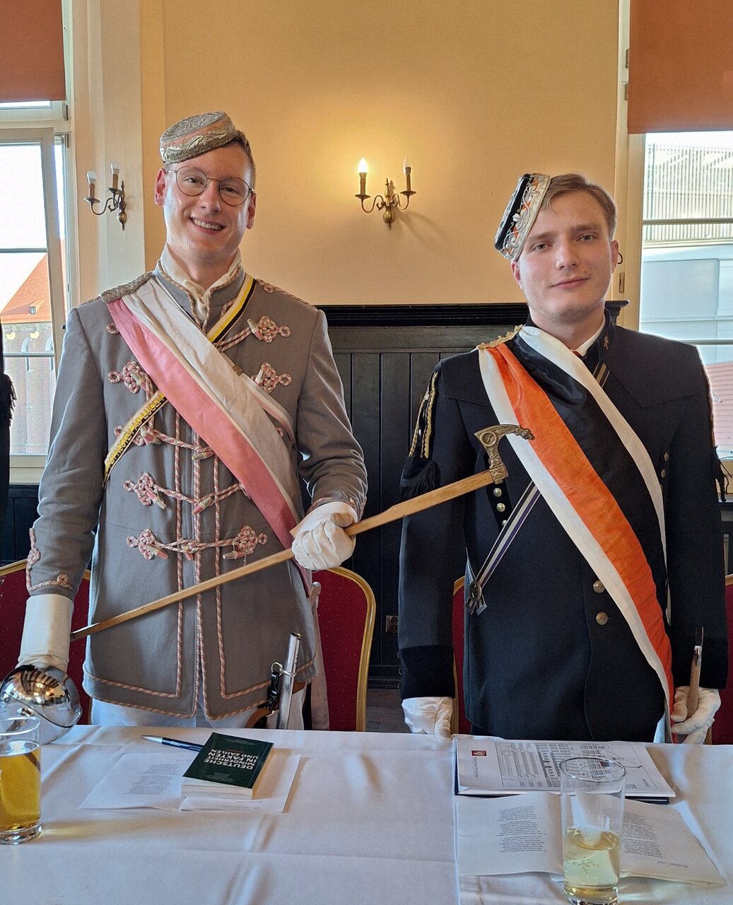 (l.) Philipp Spitzlei, Senior der Rheno-Palatia, mit einem traditionellem altem Schläger, als Geschenk der Salia-Silesia, im Griff.(r.) Robert Piosek, Senior der AV Salia-Silesia.