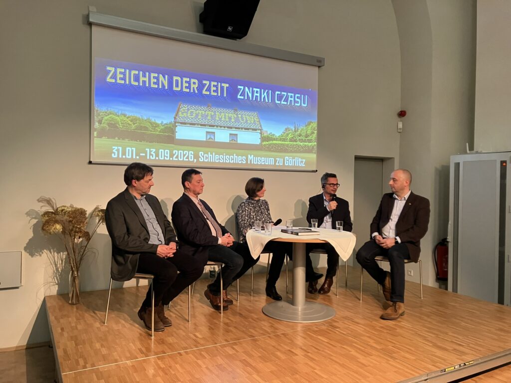 Zur Ausstellungseröffnung diskutierten im Podium: Kulturreferentin für Schlesien Agnieszka Bormann (Mitte), v.l.: Thomas Voßbeck, Dawid Smolorz, Daniel Gibski und Lucjan Dzumla.