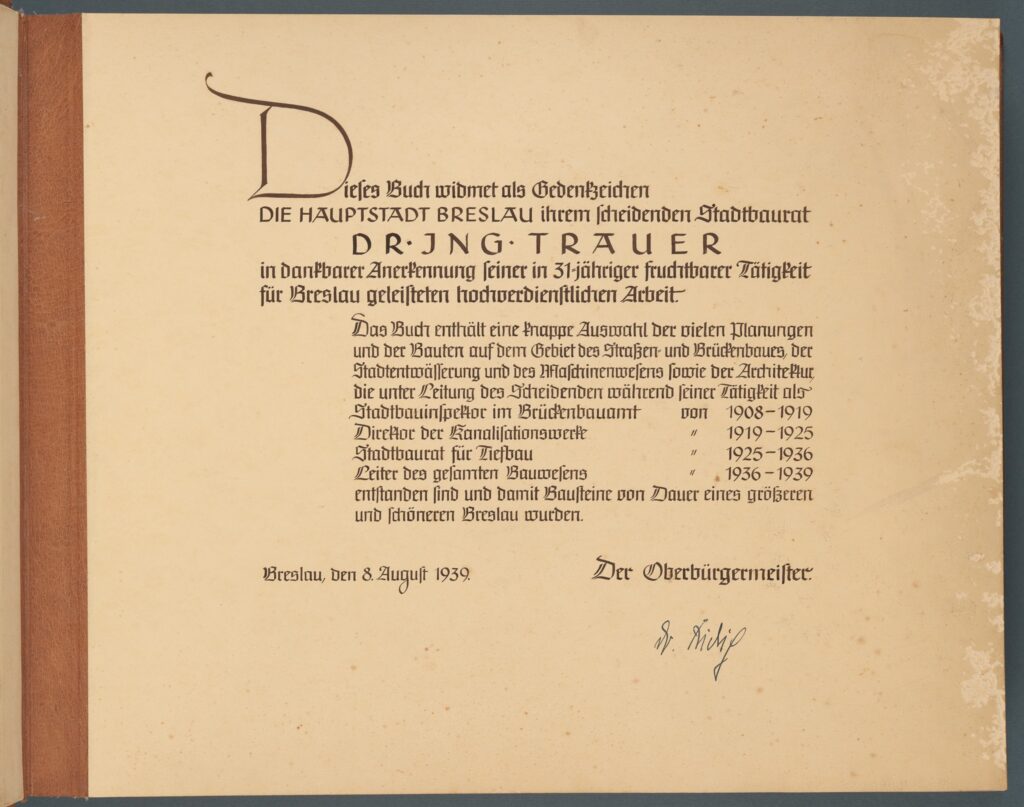 „Die Hauptstadt Breslau ihrem scheidenden Stadtbaurat Dr. Günther Trauer“.
