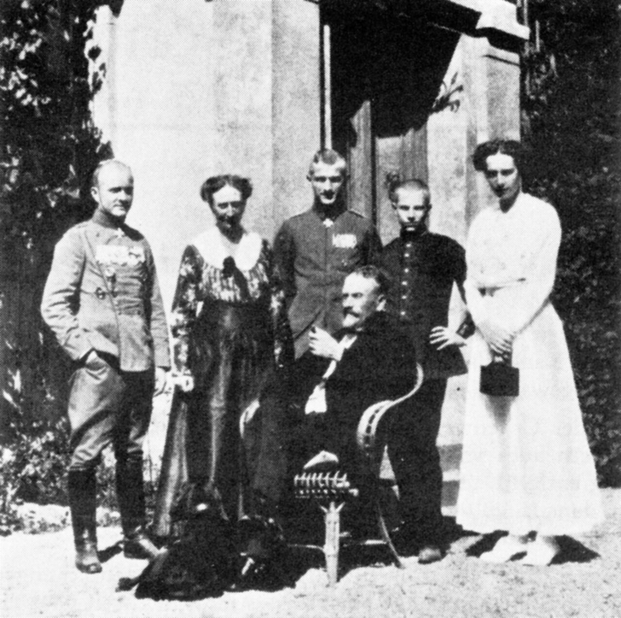 Familie von Richthofen 1918: In der Mitte sitzend der Vater Albrecht; stehend von links nach rechts Manfred, die Mutter Kunigunde und die Geschwister Lothar, Bolko und Ilse.