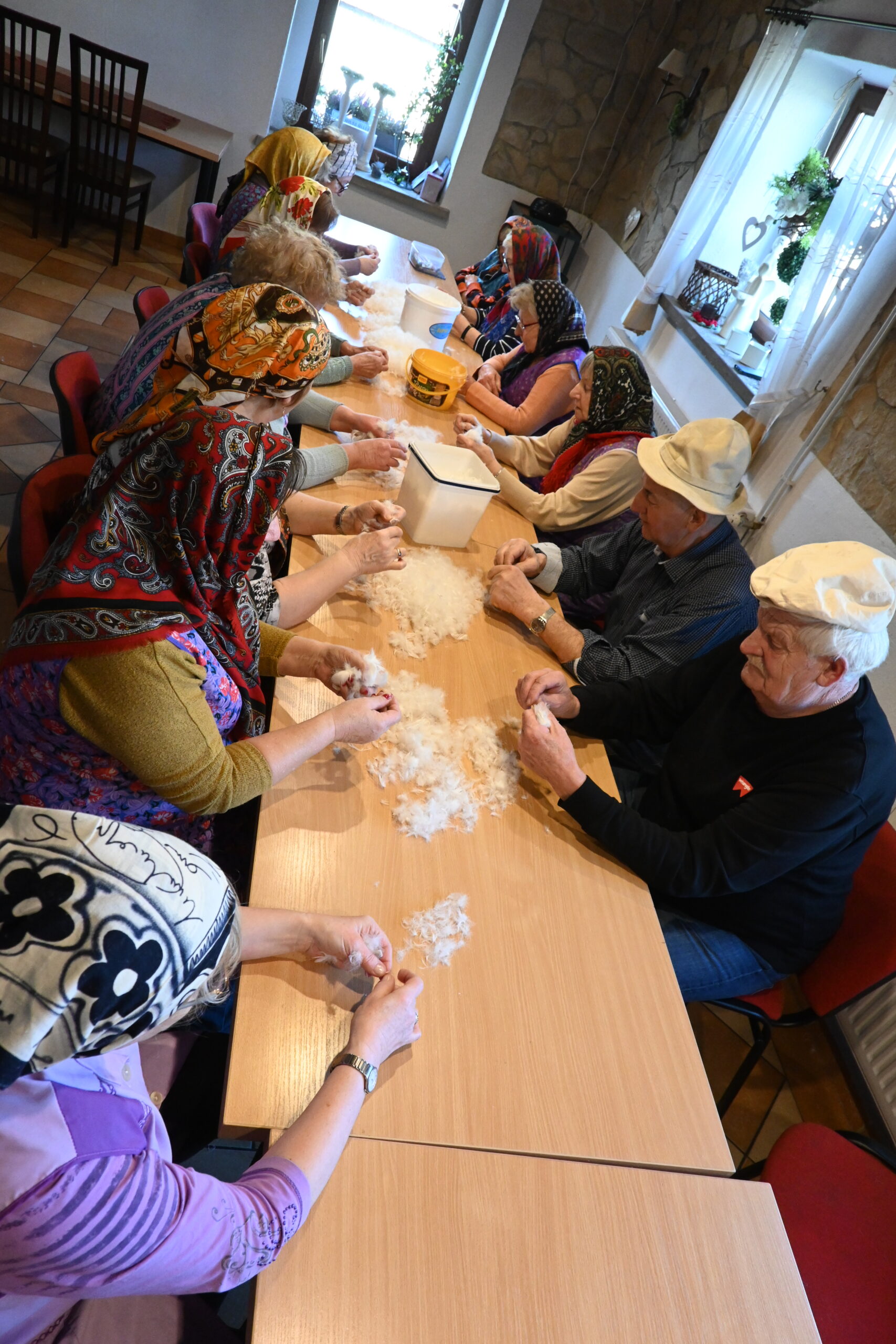 Im Seniorenclub in Nakel (Nakło) floss die Zeit letzte Woche ein wenig anders. In der Luft schwebte feiner Flaum, und der Raum war erfüllt von Erzählungen im schlesischen Dialekt, Gesang und Lachen. Genau hier wurde eine der schönsten dörflichen Traditionen wieder zum Leben erweckt – das Federnschleißen, auch „Szkubanie“ oder „darcie pierza“ genannt.