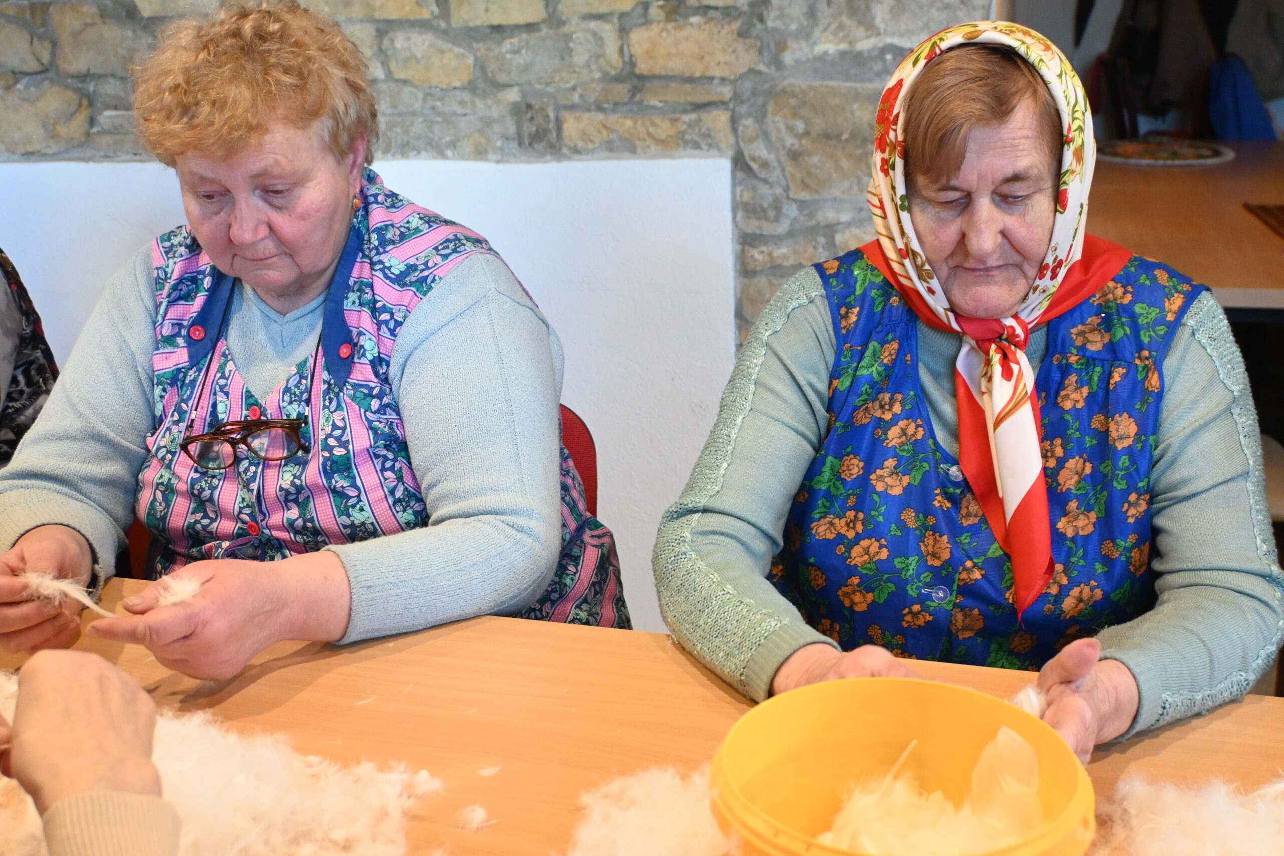 Der größte Feind beim Federnschleißen ist… das Niesen. „Oh, wenn jemand geniest hat, dann war was los! Alle Federn flogen in die Luft“, lacht Krystyna Cichoń während der Arbeit mit dem kostbaren Gut. Dorota Wrzeciono fügt hinzu: „Man muss vorsichtig sein. Man darf nicht zu stark pusten oder sich zu schnell bewegen. Selbst wenn man Witze erzählt, muss man beim Lachen das Gesicht wegdrehen, um den Flaum nicht zu verwehen.“