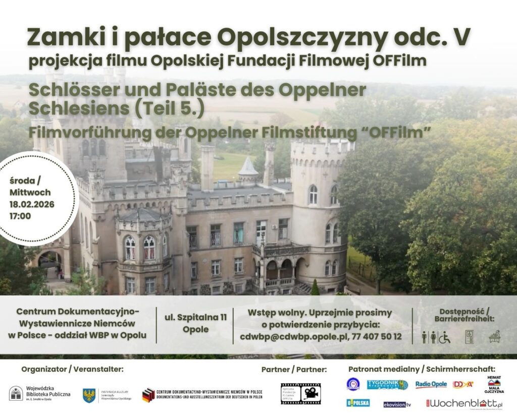 Am 18. Februar 2026 um 17:00 Uhr findet eine Filmvorführung aus der Reihe „Schlösser und Herrenhäuser in der Region Oppeln“ statt, produziert von der Oppelner Filmstiftung OFFilm. Der Film stellt die Geschichte der historischen Bauwerke in Groß Stein, Groß Strehlitz, Dambrau und Endersdorf vor, zeigt nicht nur Architektur und mit der Zeit verbundene Ereignisse, sondern auch lokale Akteurinnen und Expertinnen für Denkmalschutz. Die Vorführung wird von Wiesław Duda, dem Vorsitzenden der Stiftung, kommentiert. Der Eintritt ist frei; eine vorherige Anmeldung telefonisch (77 407 50 12) oder per E‑Mail (cdwbp@cdwbp.opole.pl) wird erbeten.