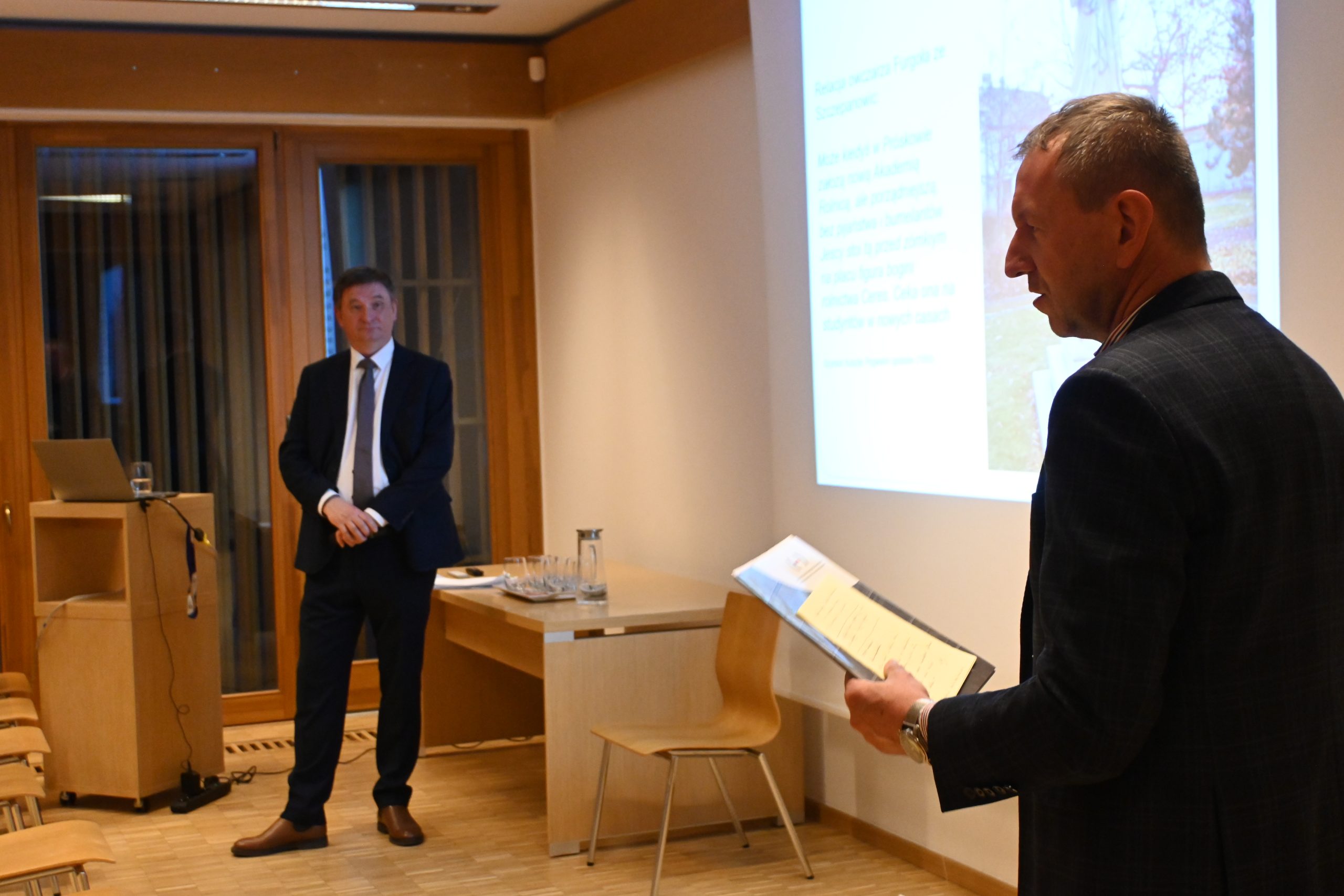 In einem Veranstaltungsaal des Museums startete um 17.00 Uhr der Vortrag. Nur einige wenige aber interessierte Besucher nahmen Platz, während Professor Patelski noch die Technik vorbereitete. Unter ihnen die Organisatoren der Veranstaltung Norbert Rasch, Bevollmächtigter für kulturelle Vielfalt des Woiwodschaftsrates Oppeln und Beata Świątek, Direktorin des Oppelner Dorfmuseums.