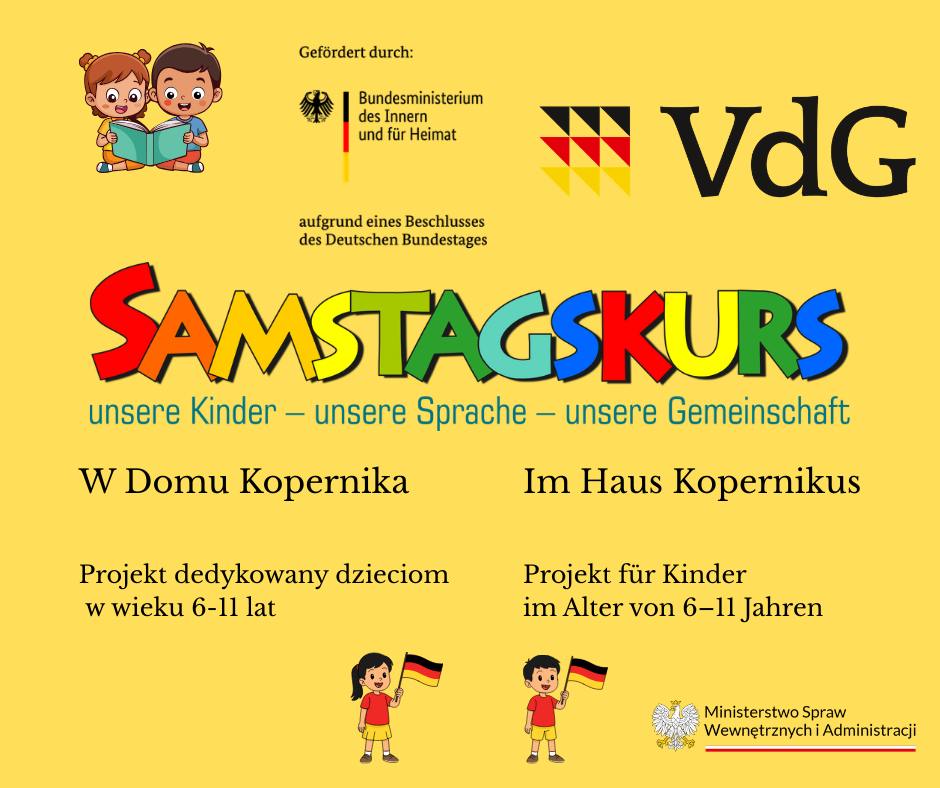 Die Allensteiner Gesellschaft der Deutschen Minderheit lädt Kinder im Alter von 6 bis 11 Jahren zur neuen Ausgabe des Projekts „Samstagskurs“ ein. Die Kurse finden samstags vormittags im Haus Kopernikus (ul. Partyzantów 3, 3. Stock, Allenstein) statt. Das Projekt umfasst zehn Treffen, bei denen die Kinder Deutsch durch Lernspiele, kreative Bastelangebote sowie kommunikative Übungen erlernen. Anmeldungen werden telefonisch unter 895 236 990 sowie per E-Mail an biuro@agdm.pl entgegengenommen. Über die Aufnahme entscheidet die Reihenfolge der eingegangenen Anmeldungen. Da die Zahl der Plätze begrenzt ist, wird eine frühzeitige Anmeldung empfohlen.