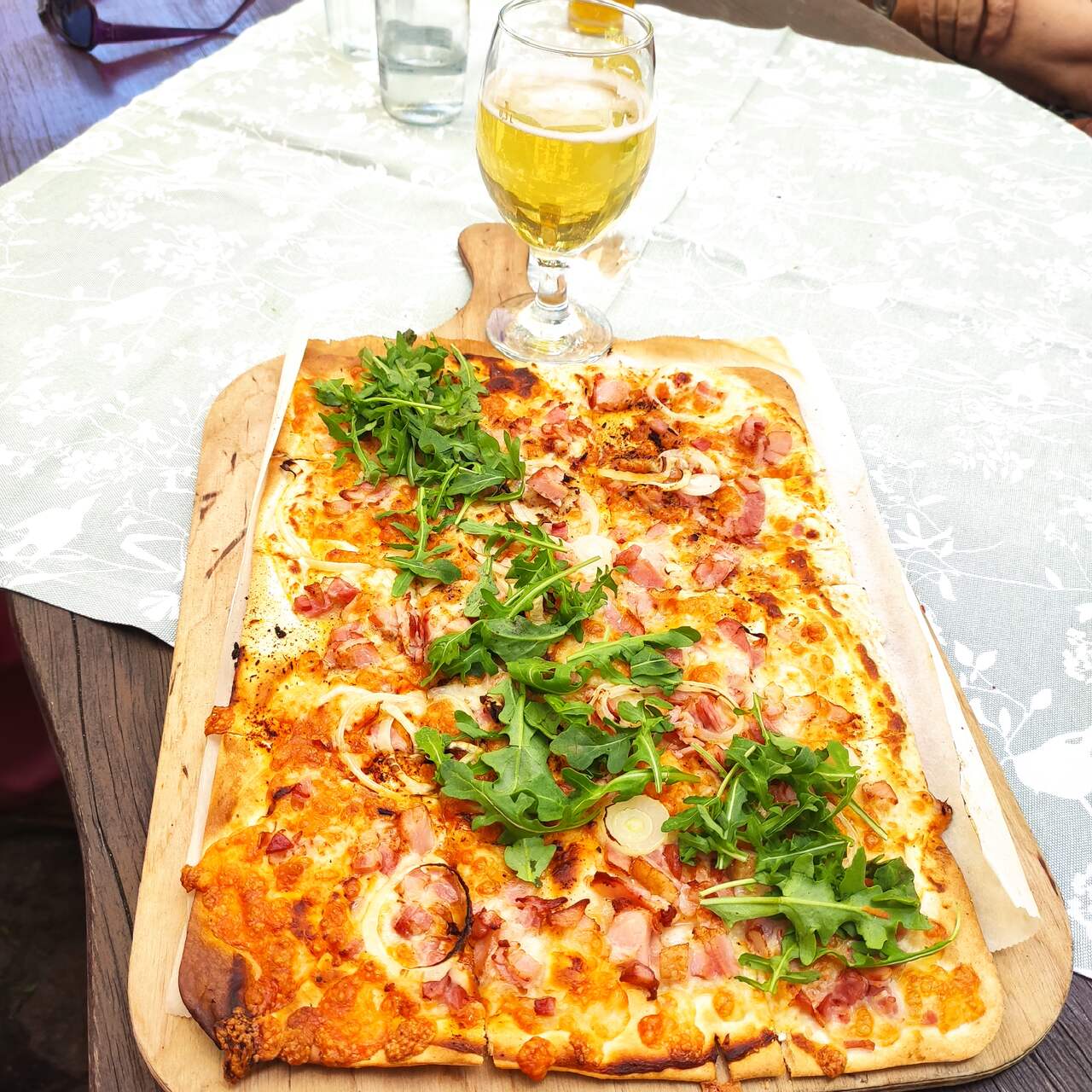 Da wir Fladenbrote lieben und nun auch wissen, wo man sie findet, führte uns der nächste Tag nach Lubiąż. Gleich neben dem ehemaligen Zisterzienserkloster betreibt man dort die „Ritterliche Schenke“. Auf der Karte stehen drei verschiedene Fladenbrote – mein Favorit ist eine eher traditionelle Version: hauchdünner Teig, bestrichen mit gewürztem Sauerrahm, belegt mit Speck, Zwiebeln, Rosmarin und frischen Rucolablättern. Die Mönche lebten sehr bescheiden, ergänzten ihre Speisen jedoch mit Gemüse und Früchten aus den klösterlichen Gärten.