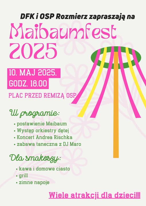 DFK Rosmierz lädt am 10. Mai um 18.00 Uhr zum Feuerwehrplatz, wo in Begleitung des Blasorchester der Maibaum aufgestellt wird. Auf dem Programm stehen außerdem: Konzert von Andrea Rischka, Tanzparty mit DJ Maro, Grill, Kaffee und Kuchen.