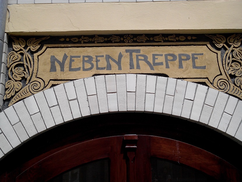 Im Innenhof (des ehemaligen Kaufmannsheims) finden sich noch wunderschöne deutsche Jugendstilinschriften.
