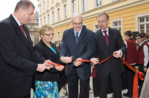 Eröffnung des Museums im Königsschloss am 19. April 2009 (v.l.): Stadtpräsident Rafał Dutkiewicz, die Direktorin im Amt für städtische Investitionen, Frau Urszula Badura, Museumsdirektor Maciej Łagiewski, Kulturminister Bogdan Zdrojewski