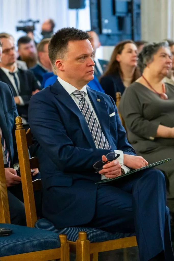 Marszałek Sejmu RP Szymon Hołownia podczas konferencji na temat 20 lat ustawy o mniejszościach narodowych i etnicznych