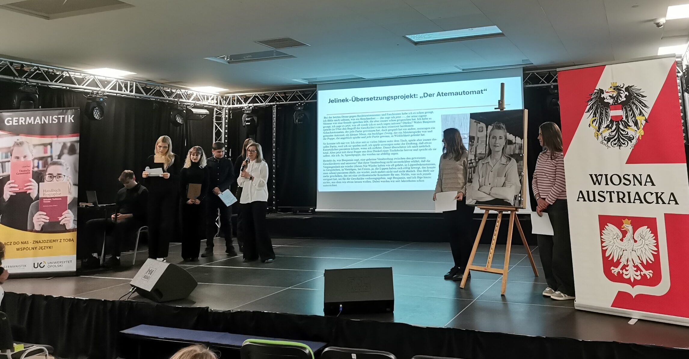 Bei der Veranstaltung in den Räumlichkeiten des Studentischen Kulturzentrums der Universität Oppeln erhielt das junge Publikum einen interessanten kulturellen Einblick in das Leben der Österreicherin Elfriede Jelinek sowie in andere zeitgenössische österreichische Literatur.