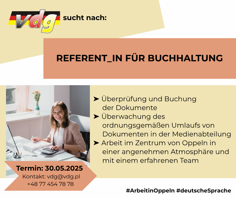 Der Verband der deutschen sozial-kulturellen Gesellschaften in Polen (VdG) sucht nach einer Person für die Stelle: Referent_in für Buchhaltung in der Medienabteilung.