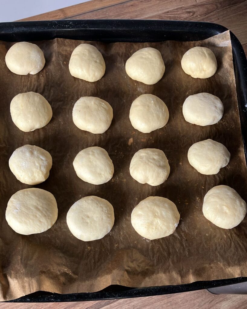 Mit einem Löffel kleine Teigportionen aus der Schüssel nehmen. Wenn möglich, am besten 40 g wiegen – so werden alle Krapfen gleich groß. Mit in geschmolzenem Fett getauchten Fingern kleine Kreise formen, 1/2 Teelöffel Marmelade oder andere Füllung in die Mitte setzen. Sorgfältig verschließen und zu Kugeln formen. Die verschlossenen Krapfen auf das bemehlte Brett legen. Mit einem sauberen Tuch abdecken (währenddessen das Fett stärker erhitzen). Bevor der letzte Krapfen geformt ist, sind die ersten bereits fertig zum Frittieren.
