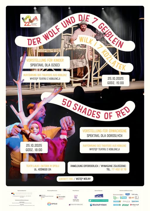 • Im Rahmen der Deutschen Kulturtage gibt es am Samstag gleich zwei Theateraufführungen des Theaters aus Koblenz im Oppelner Puppentheater. Um 15 Uhr für Kinder und um 18 Uhr für Erwachsene. Es gibt noch freie Plätze; um dabei zu sein, muss man sich vorher bei der Sozial-Kulturellen Gesellschaft der Deutschen anmelden, per Mail: sabina.kawecka@skgd.pl oder telefonisch: 77 402 10 70.