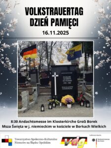 Ebenfalls am Sonntagmorgen, 16. November, 8:30 Uhr, wird in der Klosterkirche in Groß Borek eine heilige Messe in deutscher Sprache gefeiert – zum Gedenken an die Gefallenen und Vermissten des Zweiten Weltkriegs.