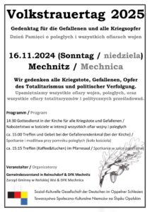 Am Sonntag, 16. November 2025, treffen sich die Einwohner von Mechnitz, um gemeinsam der Gefallenen sowie der Opfer von Kriegen, totalitären Systemen und politischer Verfolgung zu gedenken.