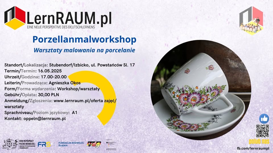 DFK Stubendorf veranstaltet am 16. Mai einen Porzelanmalworkshop für Erchwachsene im Rahmen des Projekts LernRAUM.pl. Die Volkskünstlerin Agnieszka Okos zeigt, wie man kunstvoll das Porzellan verzieren kann. Nebenbei werden die Teilnehmer auch deutschen Wortschatz lernen. Anmelden kann man sich unter www.lernraum.pl. Der Workshop beginnt um 17.00 Uhr im DFK-Sitz.
