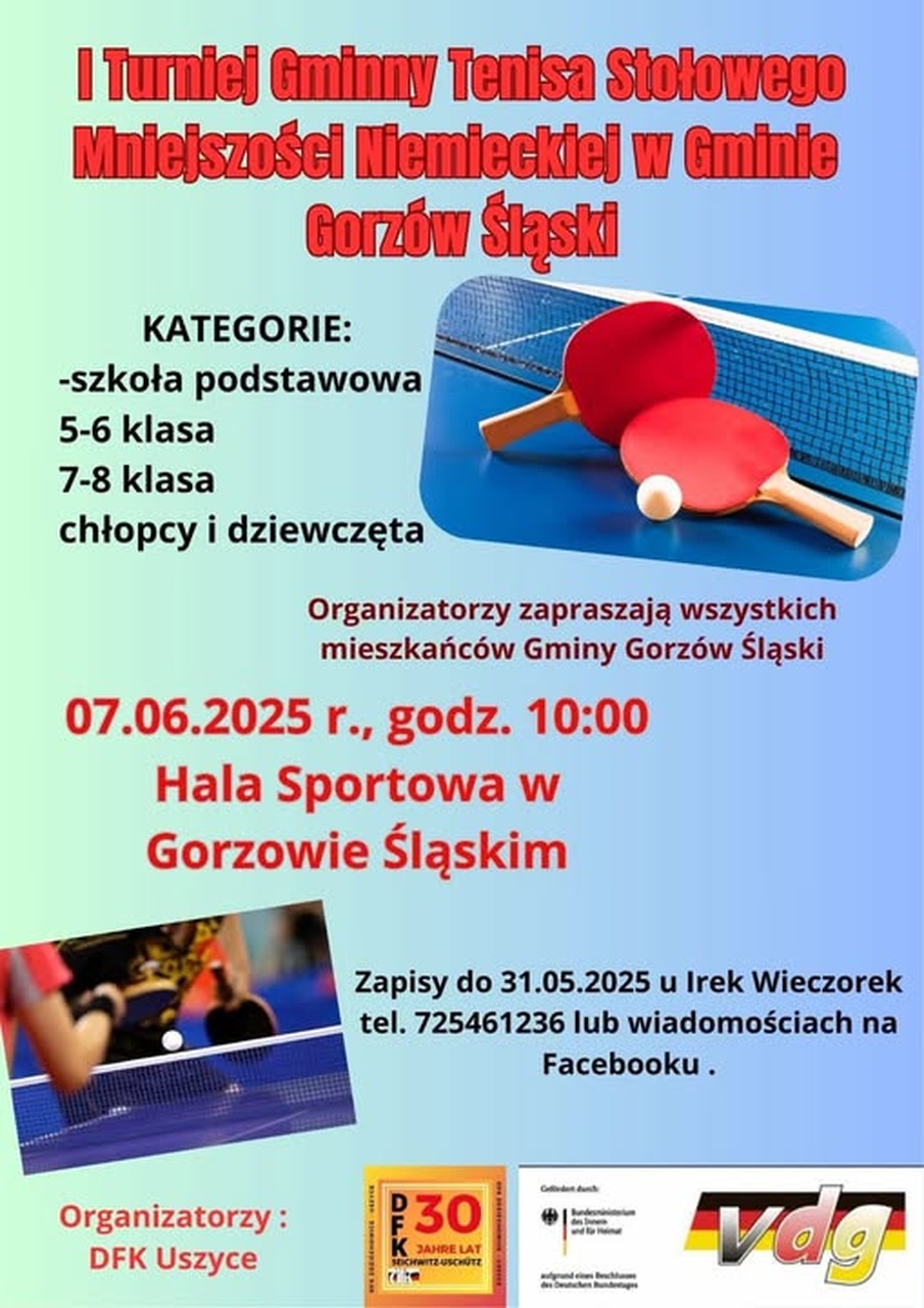 Der DFK Uschütz lädt herzlich zum 1. Gemeindeturnier im Tischtennis der Deutschen Minderheit ein, das am 7 Juni um 10:00 Uhr in der Sporthalle in Landsberg stattfinden wird. Das Turnier wird in vier Kategorien ausgetragen: Grundschule, Klassen 5–6, Klassen 7–8, Jungen und Mädchen. Alle Einwohner der Gemeinde Landsberg sind herzlich willkommen. Anmeldung bis zum 31. Mai bei Irek Wieczorek unter der Telefonnummer 725 461 236 oder per Nachricht auf Facebook.