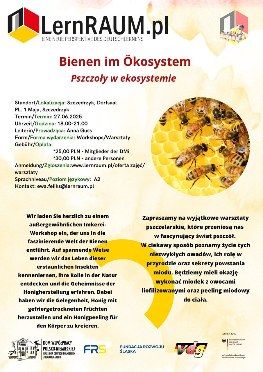 Am 27. Juni 2025 lädt der DFK Sczedrzik in Zusammenarbeit mit dem Projekt LernRAUM.pl herzlich zu einem besonderen Workshop zum Thema „Bienen im Ökosystem“ ein. Die Veranstaltung findet von 18:00 bis 21:00 Uhr im Dorfsaal in Sczedrzik) statt und richtet sich an alle, die sich für die faszinierende Welt der Bienen interessieren. Unter der Leitung von Anna Guss erhalten die Teilnehmerinnen und Teilnehmer auf unterhaltsame und lehrreiche Weise Einblicke in das Leben dieser bemerkenswerten Insekten. Der Workshop beleuchtet nicht nur die wichtige Rolle der Bienen in der Natur, sondern auch die Geheimnisse der Honigherstellung. Ein besonderes Highlight wird das Herstellen von Honigprodukten: Es besteht die Möglichkeit, Honig mit gefriergetrockneten Früchten zu kombinieren sowie ein natürliches Honigpeeling für den Körper zu kreieren. Die Teilnahmegebühr beträgt 25 PLN für Mitglieder der DMi und 30 PLN für andere Personen. Die Veranstaltung richtet sich an Personen mit Sprachniveau A2. Anmeldungen und Kontakt: ewa.feliks@lernraum.pl. Das Projekt wird gefördert vom Bundesministerium des Innern und für Heimat der Bundesrepublik Deutschland.