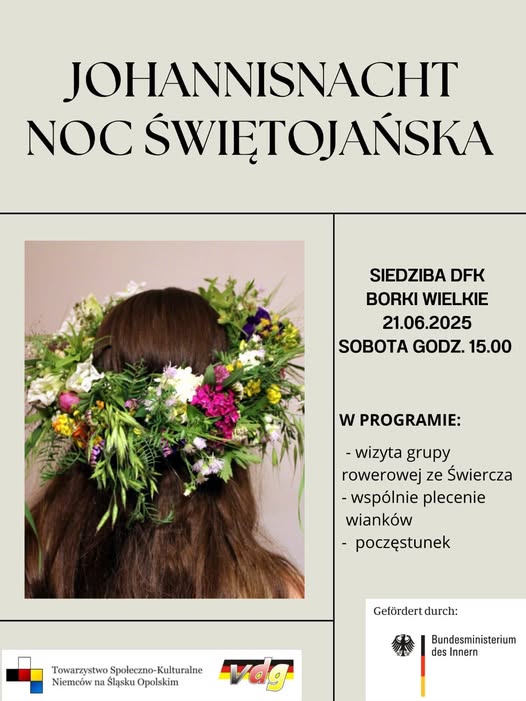Am Samstag, den 21. Juni 2025, findet beim DFK Groß Borek ein besonderes Fest im Zeichen der Tradition statt – die Johannisnacht. Beginn ist um 15:00 Uhr in den Räumlichkeiten des DFK in Groß Borek. Im Rahmen der Feier wird die Fahrradgruppe des DFK Schönwald (Świercze) empfangen, die zuvor an einem gemeinsamen Fahrradausflug teilgenommen hat. Geplant ist ein gemeinsames Kränzeflechten aus Blumen und Kräutern, wie es zur Johannisnacht Brauch ist, sowie ein gemütliches Beisammensein bei einem kleinen Imbiss. Die Johannisnacht ist eine Tradition rund um die Sommersonnenwende und steht für Naturverbundenheit, Gemeinschaft und Lebensfreude. Der DFK Groß Borek lädt alle Mitglieder und Interessierten herzlich ein, an diesem Nachmittag teilzunehmen und die Tradition gemeinsam zu pflegen. Die Veranstaltung wird gefördert durch das Bundesministerium des Innern und für Heimat.