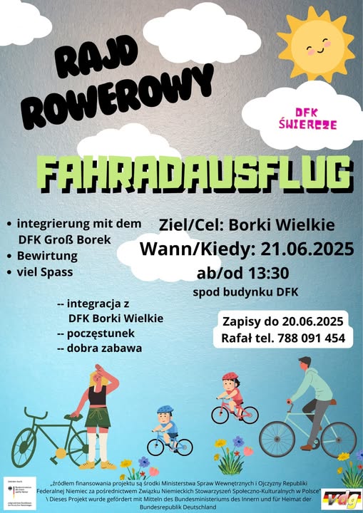 Der DFK Schönwald lädt herzlich zu einem Fahrradausflug nach Groß Borek (Borki Wielkie) ein, der am Samstag, den 21. Juni 2025 stattfinden wird. Der Start ist um 13:30 Uhr vor dem DFK-Gebäude in Schönwald. Im Mittelpunkt der Veranstaltung stehen die Integration mit dem DFK Groß Borek, ein gemütliches Beisammensein sowie viel Spaß und Bewegung an der frischen Luft. Für Verpflegung ist selbstverständlich gesorgt. Alle Interessierten sind herzlich eingeladen, gemeinsam einen aktiven und geselligen Nachmittag zu erleben. Anmeldung bis zum 20.06.2025 bei Rafał unter der Nummer 788 091 454.Die Veranstaltung wird gefördert aus Mitteln des Bundesministeriums des Innern und für Heimat der Bundesrepublik Deutschland.