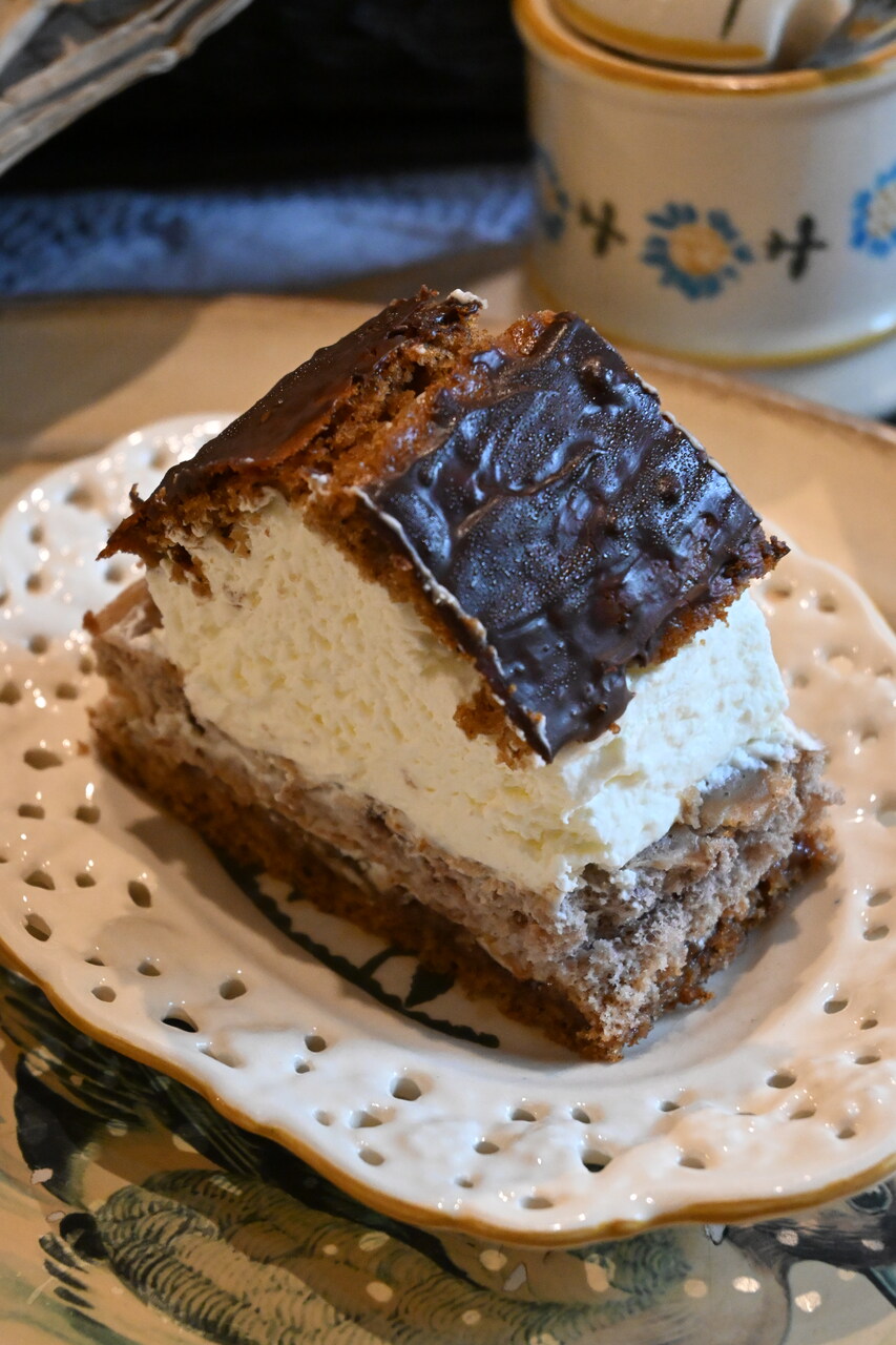 Na spodzie formy układamy grubszy blat ciemnego ciasta, smarujemy powidłami i cienką warstwą kremu. Kładziemy jasny biszkopt, a na nim pozostałą masę – formujemy z niej kształt dachów (trójkątów). Na wierzch kładziemy cienkie kawałki ciemnego ciasta – tworząc cztery spadziste dachy. Smarujemy je musem czekoladowym. Schładzamy kilka godzin w lodówce.