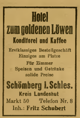 Przyjrzyjmy się bliżej jednemu z tych hoteli: „Zum goldenen Löwen”, który w 1927 roku przejął wrocławski cukiernik Fritz Schubert – autor przepisu na piernik Schömberger Bombe. W hotelu działała elegancka cukiernia i kawiarnia, gdzie można było delektować się tym korzennym przysmakiem.