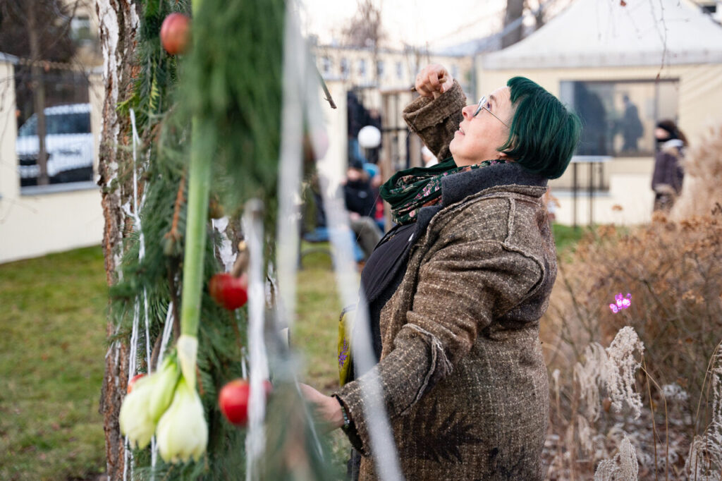 Z naturalnymi materiałami uczestnicy pracowali także pod okiem Moniki Bębenek, artystki sztuki kwiatowej i założycielki szkoły florystycznej Kwitnące Horyzonty. – Prowadziłam warsztaty, podczas których pracowaliśmy z naturalnymi materiałami i wzorem opolskim – wyjaśnia. – Dzieci przygotowywały choinki dekorowane dekupażem, a potem elementy instalacji: koronkowe wzory, jabłuszka do zawieszenia, małe choineczki, które dziś wiszą na brzozie.