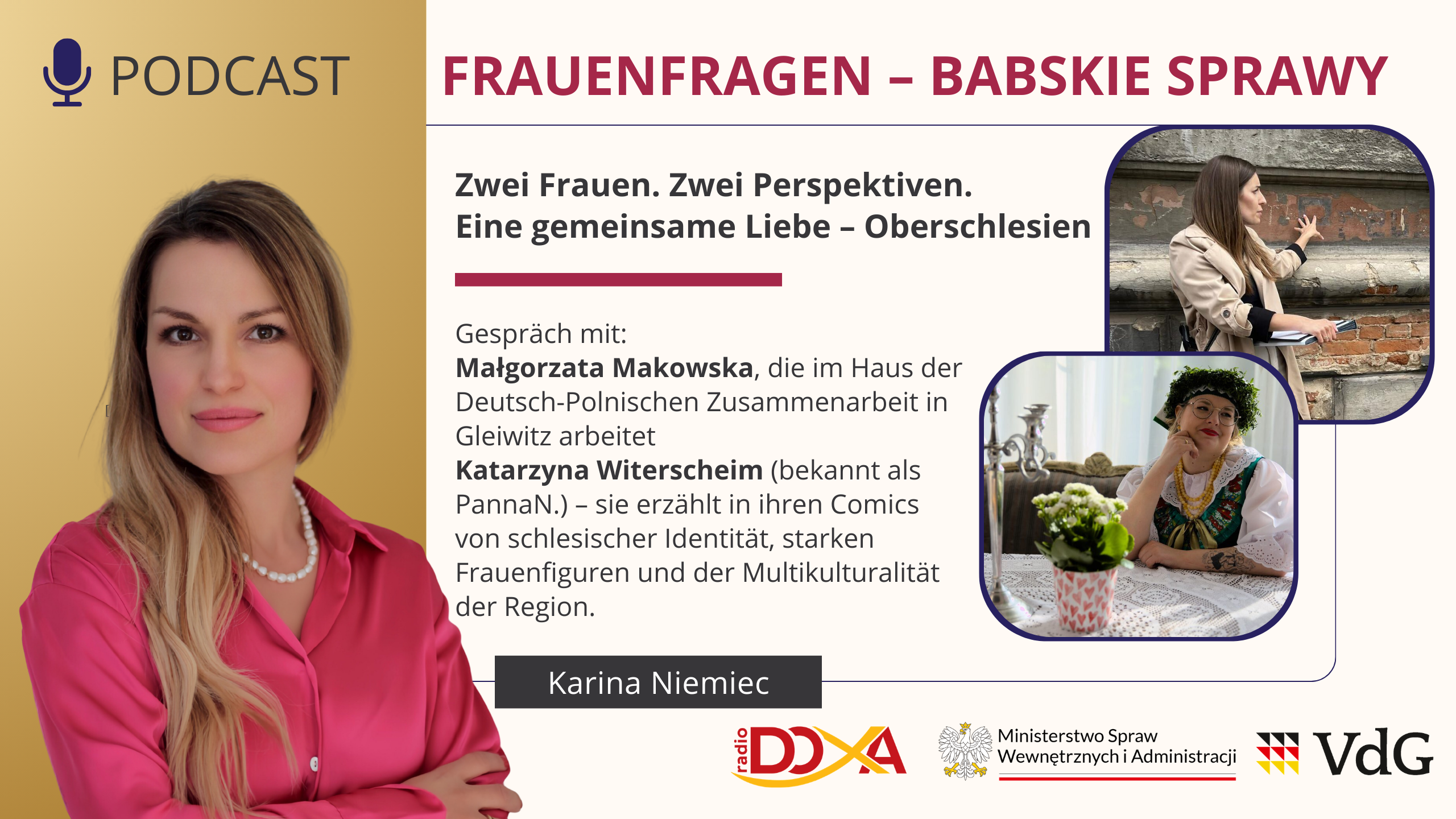Im Jahr 2025 werden unsere Radiosendungen durch eine Serie von Podcasts „Frauenfragen – Babskie sprawy“ bereichert, die nicht nur an deutschsprachige Frauen im Oberschlesien gerichtet ist, sondern auch für ein breites Publikum zugänglich sein wird. Das Programm behandelt verschiedene Themen, die für Frauen von Interesse sind, und bietet eine Plattform für den Erfahrungsaustausch.