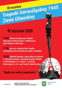 Społeczny Komitet Obchodów oraz Województwo Śląskie zapraszają mieszkańców Gliwic i całego regionu 18 stycznia do udziału w uroczystościach 81. rocznicy Tragedii Górnośląskiej Ziemi Gliwickiej: