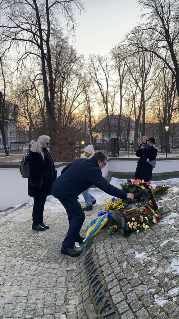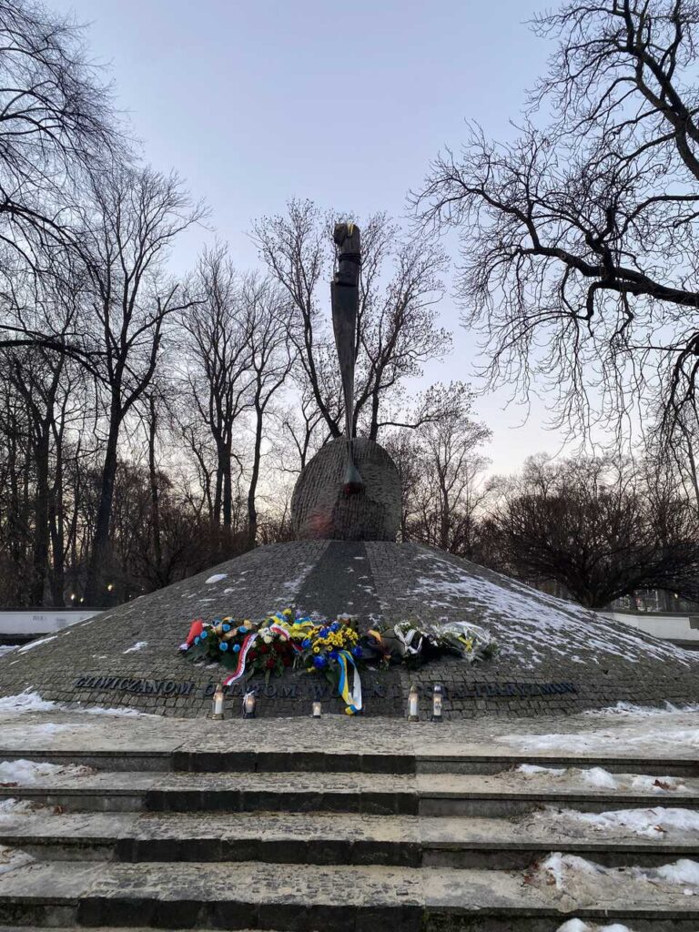Złożone wieńce pod Pomnikiem Gliwiczan, Ofiar Wojen i Totalitaryzmu w parku Chopina.