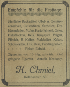 W ogłoszeniu w Bismarckhütter Zeitung (Königshütte-Bismarck, 1921) firma H. Chmiel polecała na święta między innymi kawę, czekoladę, figi – i płatki owsiane.