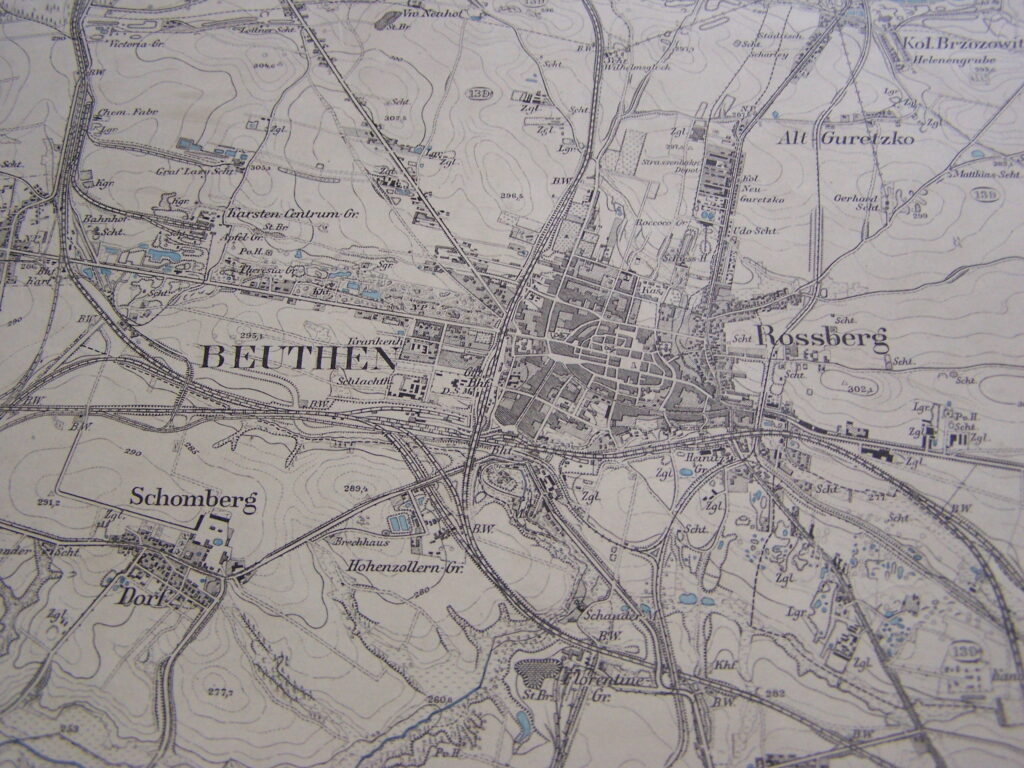 Das Stadtgebiet auf einer alten Landkarte: Beuthen mit Schomberg und Rossberg.