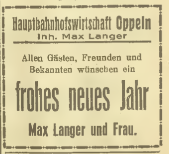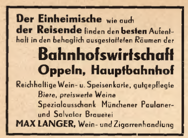 Opolski dworzec Kolei Górnośląskiej miał jeszcze mniej szczęścia – nie istnieje już wcale. Kiedyś działała tu jednak poczekalnia i restauracja, w której podróżni mogli odpocząć i posilić się przed dalszą drogą. Lokal przyciągał również mieszkańców, oferując bogatą kartę dań i win oraz dobrej jakości piwo, zwłaszcza z browarów Münchener Paulaner i Salvator. Właściciel Max Langer reklamował lokal w Oppelner Heimat-Kalender für Stadt und Land (1938) oraz w regionalnej prasie, m.in. w Ostdeutsche Morgenpost. Prawdopodobnie prowadził interes wspólnie z żoną, na co wskazują wspólne życzenia noworoczne publikowane w prasie.