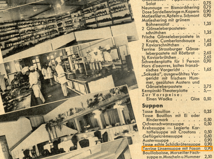 Na koniec jeszcze jeden fakt o soczewicy chciałabym z historii przywołać. Otóż znana i dziś marka Kempinski swój rozkwit rozpoczęła we Wrocławiu, otwierając w roku 1862 na Rynku (kamienica nr 56) pierwszy lokal gastronomiczny. Handel winami połączyli wywodzący się z Wielkopolski Berthold i Moritz Kempinski ze śniadaniownią (Frühstücksstube). Dawało to im możliwość serwowania wina o każdej porze dnia. Jednakże celem była również kuchnia bardziej wyrafinowana. Koncepcja marketingowa braci Kempinski „luksus dla każdego” przejawiała się w tym, iż gość dostawał połowę porcji… za pół ceny. „Der Oberschlesische Wanderer” (1931) zamieszcza reklamę winiarni z bardzo obszernym menu, a w nim: zupa z soczewicy podawana z bażantem!