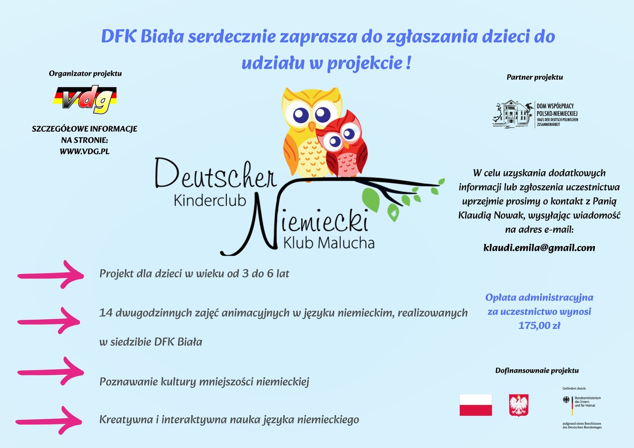 Sandra Nowa, koordynatorka projektu „Niemieckie Kluby Malucha”, informuje: „W DFK Biała trwa już nabór uczestników do nowo utworzonej grupy. Chętni rodzice mogą kontaktować się z Panią Klaudią Nowak, wysyłając wiadomość na adres klaudi.emila@gmail.com.”