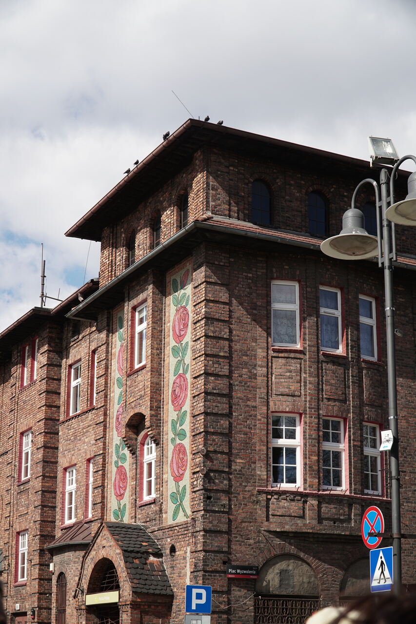 Róże widoczne na budynku poczty to mozaika. Ją także zaprojektowali Zillmannowie. W przeszłości mieściła się tu gospoda. Motyw róży to nawiązanie do „szlajfek”, czyli wstążek w rozbarskim stroju ludowym. Architekci w ten sposób w samym centrum osiedla zrobili ukłon w stronę śląskiej kultury i tradycji.