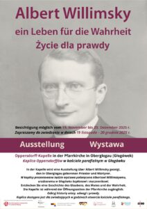 Sebastian Gerstenberg natrafił na publikację Henryki Młynarskiej, lokalnej pasjonatki historii, o Albercie Wilimskim, pochodzącym z Głogówka, która pozwoliła mu dotrzeć do źródeł z ostatniej parafii księdza we Friesack. – Okazało się, że we Friesack kult Alberta Willimsky’ego jest wciąż pielęgnowany przez miejscowe stowarzyszenie, które przygotowało dwujęzyczną wystawę i publikację na jego temat – wspomina Gerstenberg. – Chciałem ją pokazać już w marcu, podczas naszego projektu 800-lecia, ale ostatecznie udało się dopiero teraz – 18 listopada wystawa dotarła do Głogówka.