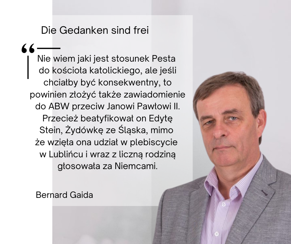Nie wiem jaki jest stosunek Pesta do kościoła katolickiego, ale jeśli chciałby być konsekwentny, to powinien złożyć także zawiadomienie do ABW przeciw Janowi Pawłowi II. Przecież beatyfikował on Edytę Stein, Żydówkę ze Śląska, mimo że wzięła ona udział w plebiscycie w Lublińcu i wraz z liczną rodziną głosowała za Niemcami. Jak sama pisze w swej autobiografii z rozgoryczeniem przyjęła decyzję o przyznaniu tego miasta Polsce, pomimo przewagi głosów na rzecz Niemiec.