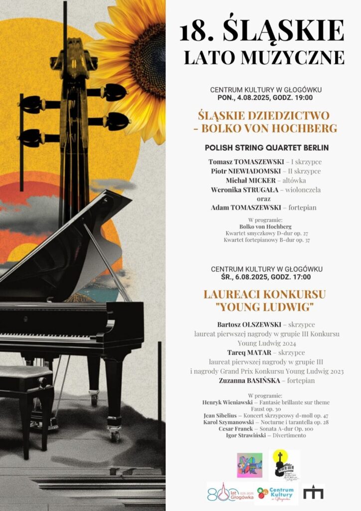 Pierwszy z koncertów – „Śląskie dziedzictwo – Bolko von Hochberg” – odbędzie się w poniedziałek, 4 sierpnia 2025 roku o godzinie 19:00 w sali widowiskowej Centrum Kultury w Głogówku. Wystąpią znakomici muzycy z zespołu Polish String Quartet Berlin: Tomasz Tomaszewski (I skrzypce), Piotr Niewiadomski (II skrzypce), Michał Micker (altówka), Weronika Strugała (wiolonczela), a także pianista Adam Tomaszewski. W programie koncertu znajdą się utwory inspirowane postacią Bolka von Hochberga oraz dzieła kameralne: kwartet smyczkowy D-dur op. 27 i kwartet fortepianowy B-dur op. 37.