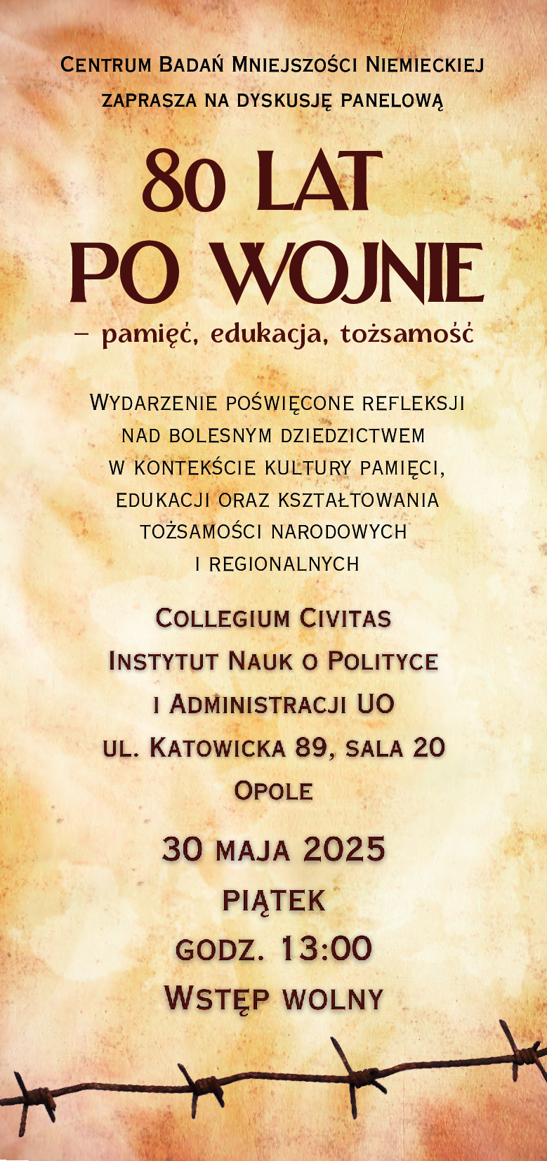 W piątek 30 maja 2025 roku w Opolu odbędzie się panel dyskusyjny zatytułowany „80 lat po wojnie – pamięć, edukacja, tożsamość”. Wydarzenie, organizowane przez Centrum Badań Mniejszości Niemieckiej / Forschungszentrum der Deutschen Minderheit, skupi się na refleksji nad trudnym dziedzictwem historycznym. Głównym punktem odniesienia będzie 80. rocznica wydarzeń określanych mianem „Tragedii Górnośląskiej”, ale dyskusja obejmie także doświadczenia innych regionów dawnego pogranicza.