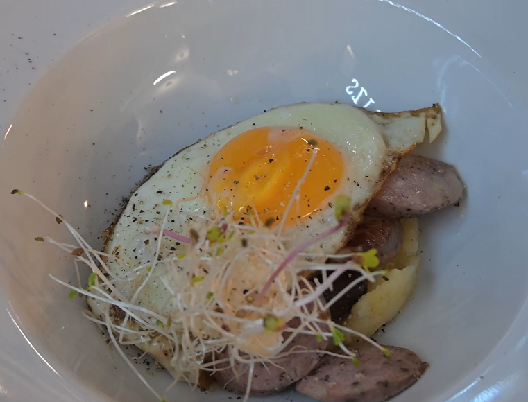 Podawaj z sadzonym jajkiem oraz tłuczonymi ziemniakami okraszonymi podsmażonym boczkiem i szczypiorkiem lub kiełkami pora.
