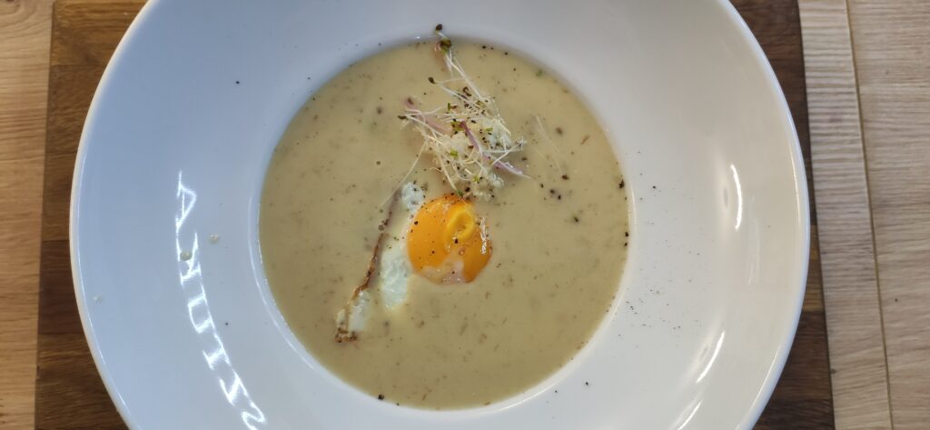 Pośród egzotycznych, choć całkiem smacznie brzmiących, potraw znalazłam zupę – i to bardzo śląską. Zalewajka średzka była po prostu przepyszna. Aksamitna, gorąca, aromatyczna, pełna smaków, które rozwijały się kolejno po sobie. Bardzo ujęło mnie podejście do produktu lokalnego – nie tylko w mojej zupie użyto miejscowych składników.