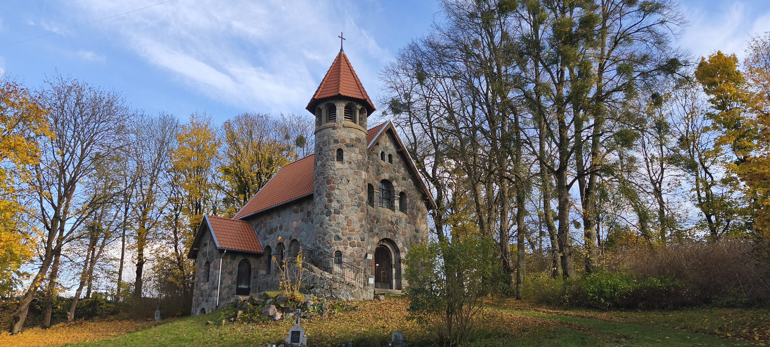 Ostatecznie w 1925 roku powstał kościół wzniesiony z kamieni polnych. Podczas gdy w wielu domach i kościołach w Prusach Wschodnich kamienie stanowią jedynie dolną warstwę murów, chroniącą przed wilgocią, w Raszągu cały budynek wykonano z tego materiału. W rezultacie powstała budowla, której okrągła wieża i ogólna forma przywodzą na myśl niewielki bajkowy zamek – taki, w którym prędzej można by się spodziewać księżniczek i wróżek zaglądających przez okna niż protestanckich pastorów natchnionych Duchem Świętym. Kościół zazwyczaj pozostaje zamknięty, a teren wokół niego, choć nie zaniedbany, porośnięty jest wysoką trawą. Na jubileusz została ona starannie skoszona, dzięki czemu świątynia ukazała się w pełnej okazałości.